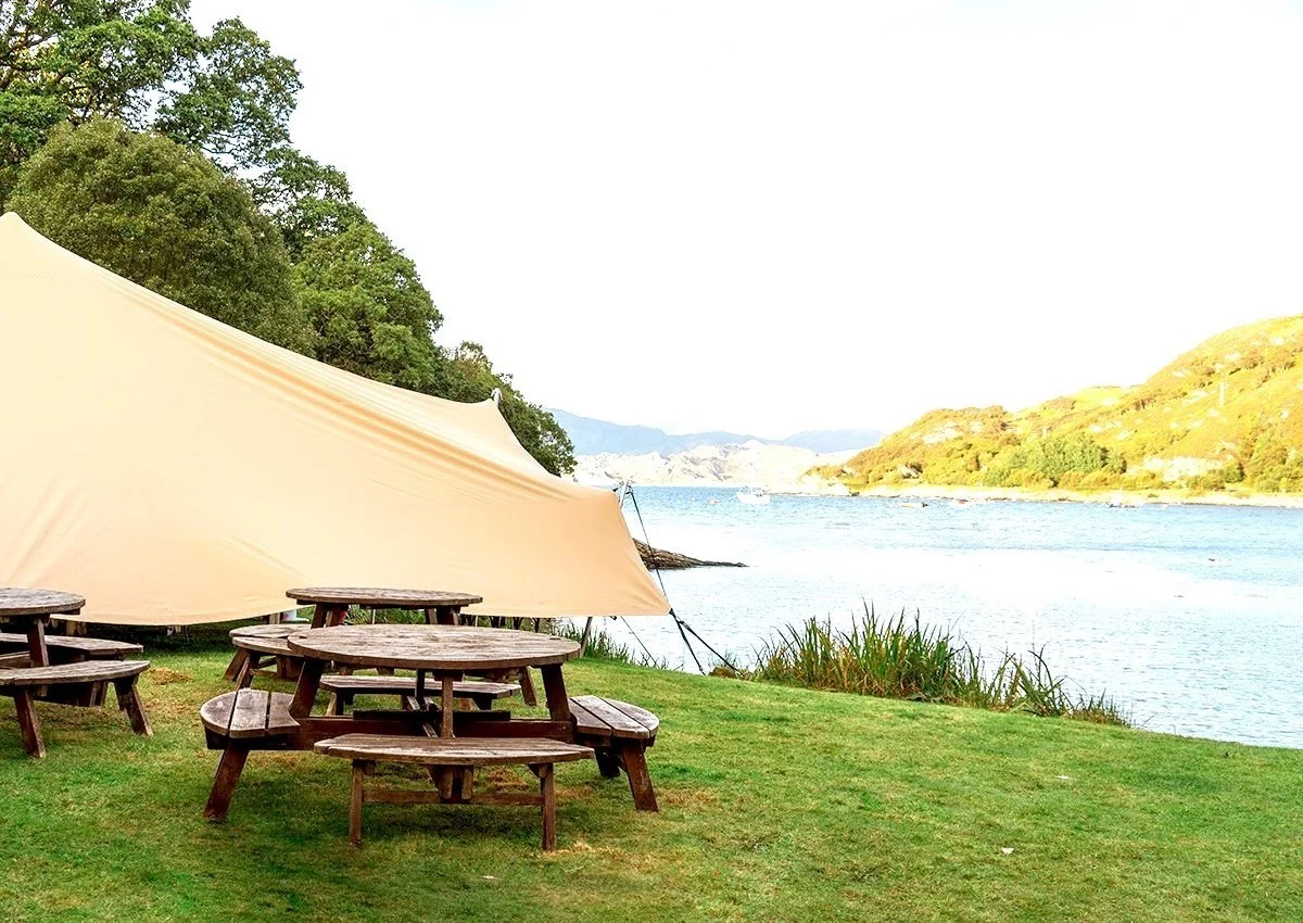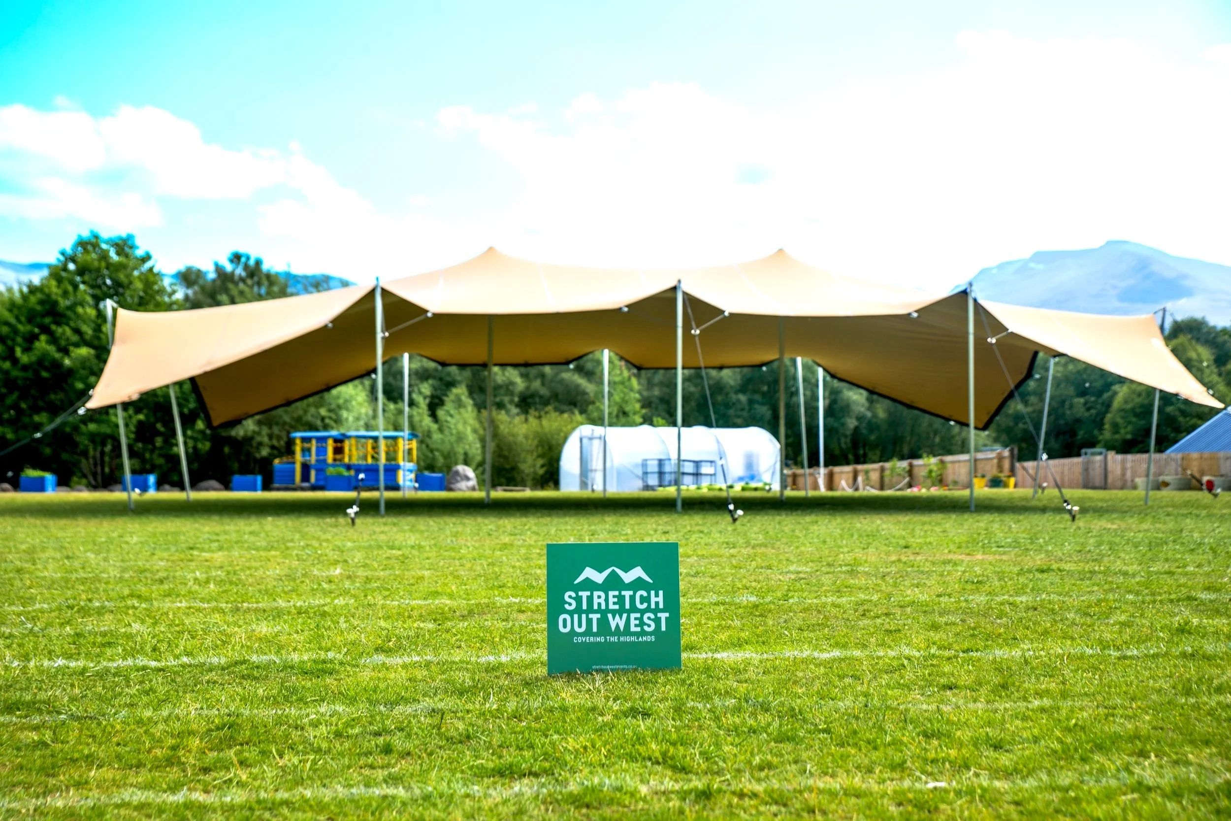 Our stretch tents are super flexible — you can leave them open for a breezy canopy feel or add sides depending on the vibe and how many people you need to fit. We’ve got two side kit options: a full-height side kit that can fully enclose the space, or a triangular side kit that brings the tent’s corners down to the ground. Just a heads-up: using the triangular sides does cut the capacity by about 30%.